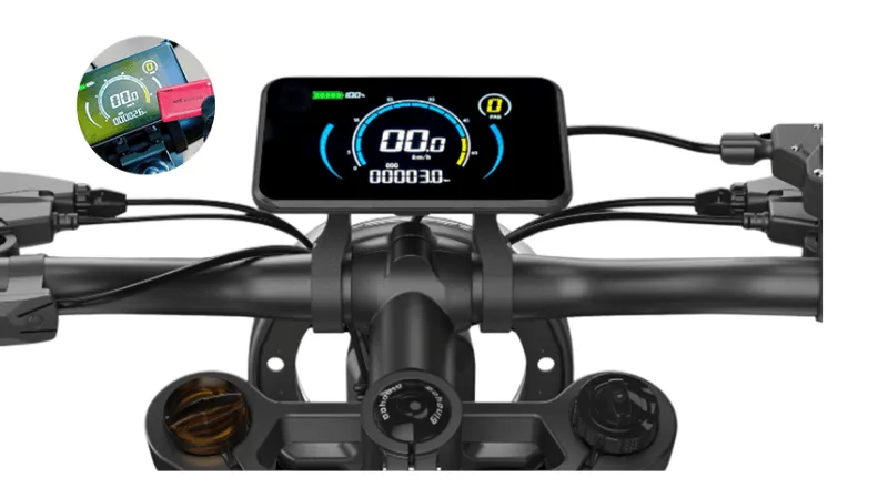 A NFC permite arranque sem chave através de cartão inteligente. O ecrã central mostra a velocidade em tempo real, nível de assistência, bateria e distância.